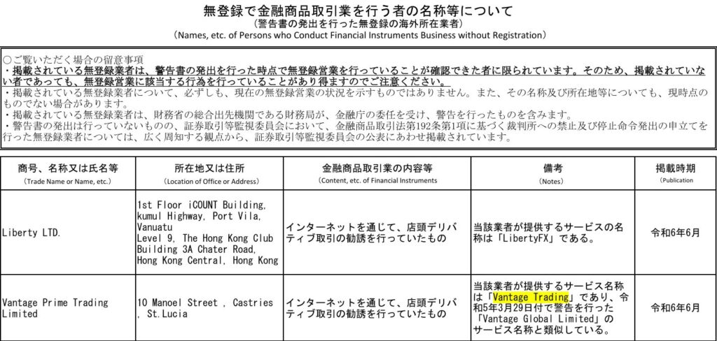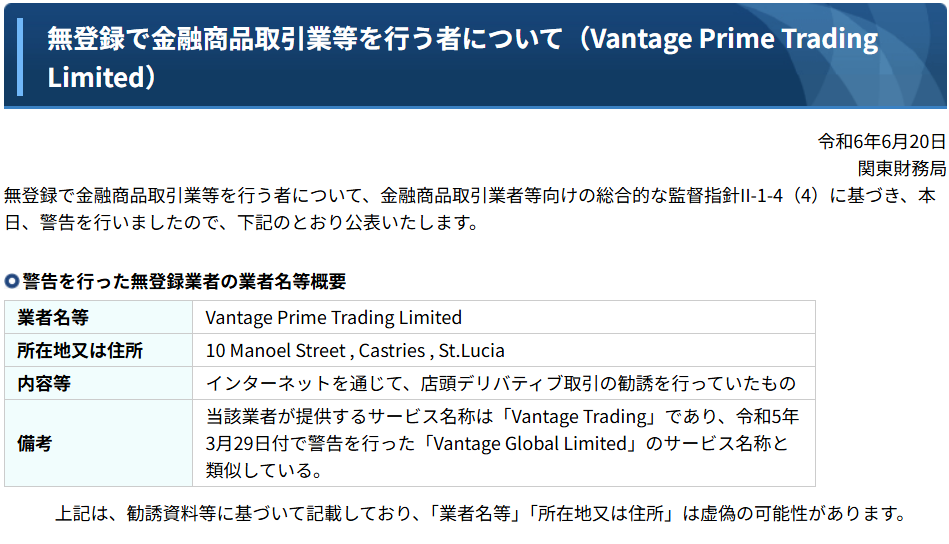 関東財務局は2025年4月25日付で「Vantage Prime Trading Limited」に対して警告を発出しており、同社は「インターネットを通じて、店頭デリバティブ取引の媒介を行っていた」として無登録での金融商品取引業の実施が指摘されています 。