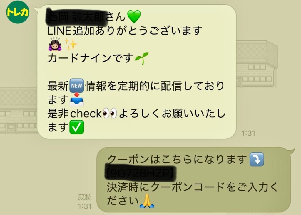 カードナインでは、公式LINEを友だち追加することでクーポンがもらえる仕組みがあります。