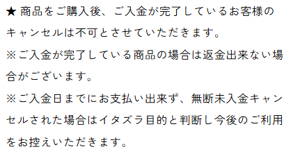 また、配送中の紛失や破損などのトラブルに対しても「当店では一切責任を負いません」と記載されており、通販に慣れていない人にとってはややハードルの高いルールです。