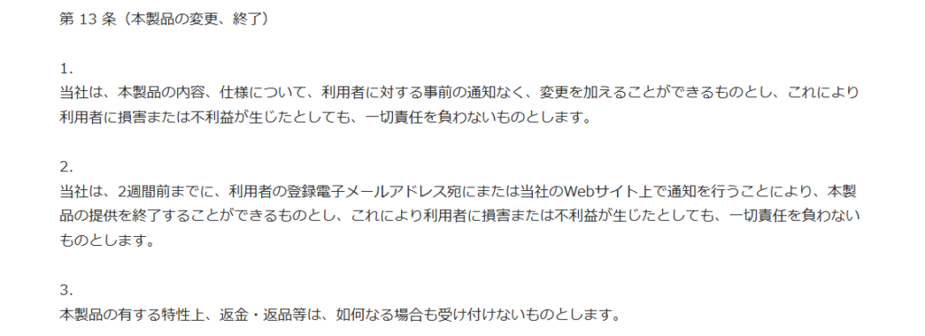 買い切り型のライセンス制を採用しているため月額課金ではありませんが、一度購入するとデジタル商品の性質上、返品・返金は一切受け付けられないと明記されています。