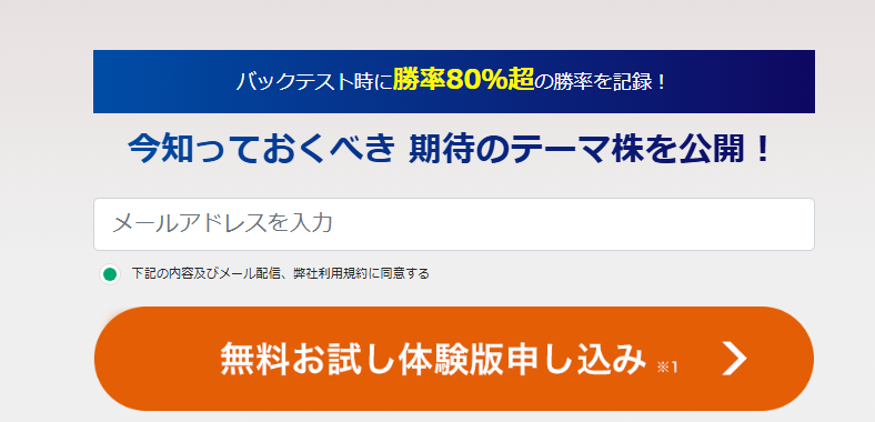 体験版ではメールアドレス登録のみでAIが抽出したテーマ株リストの閲覧などが可能とされています。