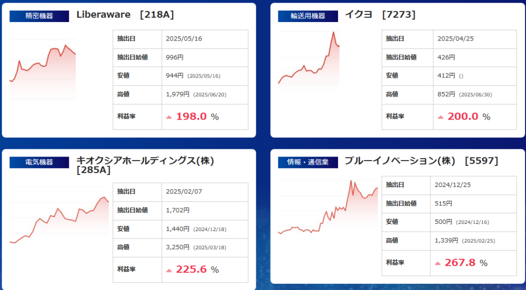 公式サイトには「Liberaware 利益率198%」「キオクシアホールディングス 利益率225%」「ブルーイノベーション 利益率267%」「イクヨ 利益率200%」といった驚異的な数値が並んでいます。
