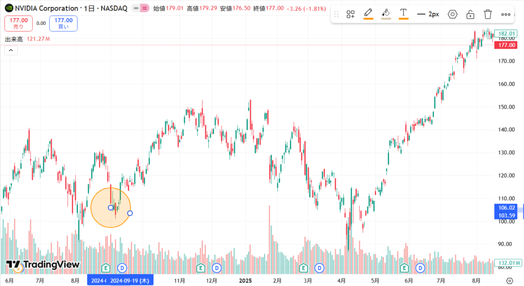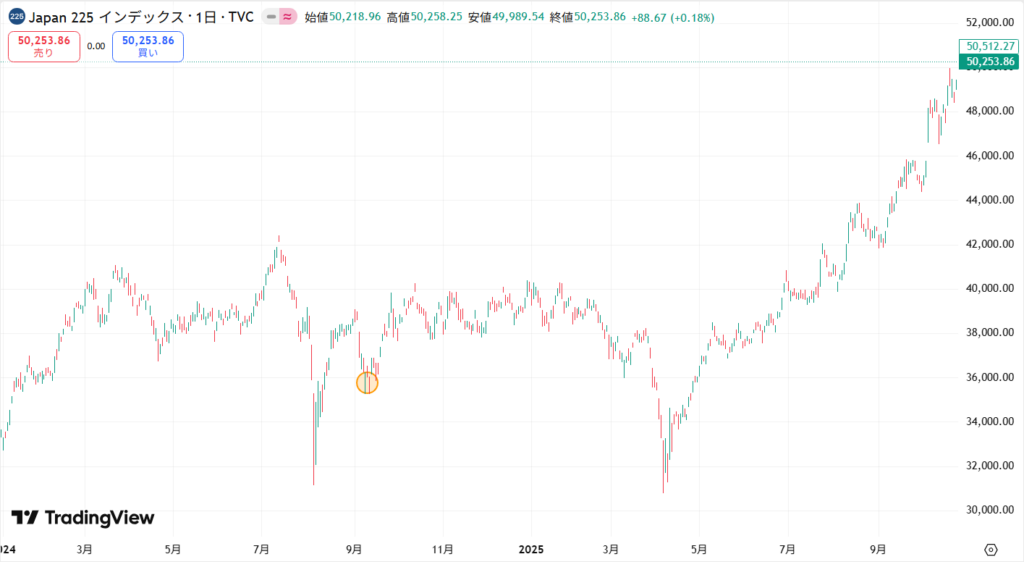 例えば2024年のAI関連株の急落では、好調な決算にもかかわらずエヌビディア株が短期間で13.9%下落し、(下記エヌビディアチャート○部分)投資家の期待と現実のギャップが露呈し、日本市場でもAIブームの巻き戻し懸念から日経平均が週次2134円安となる急落が発生しています。(下記日経平均チャート○部分)