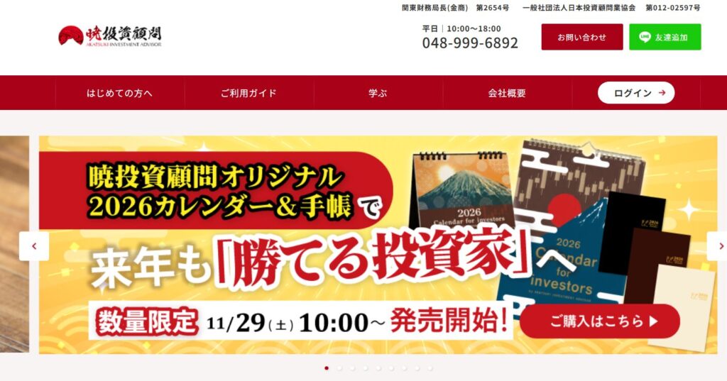 暁投資顧問を運営する株式会社暁投資顧問は、関東財務局長(金商)第2654号を取得している正規の金融商品取引業者です。