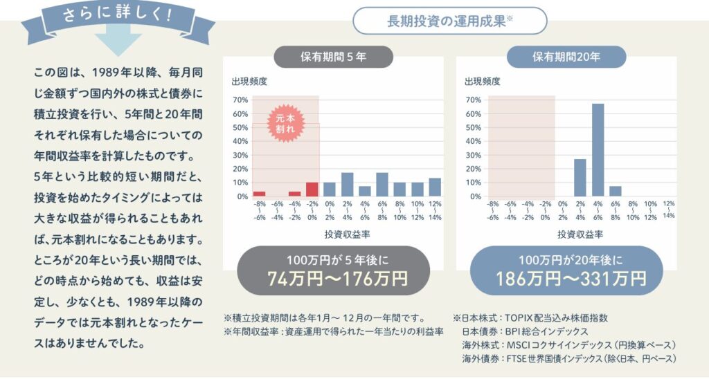 仮に、短期的に値動きがあっても、20年といった長期保有では元本割れのリスクが大幅に減少するというデータもあります。