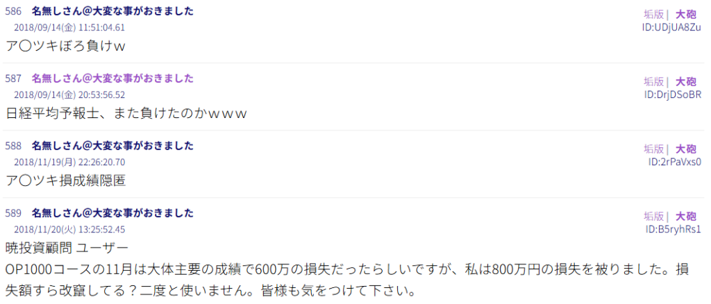 もちろんネット掲示板の情報には真偽不明なものも含まれるため、全てを鵜呑みにはできませんが、こうした深刻な損失報告が複数存在すること自体が、暁投資顧問の推奨精度やリスク管理体制に疑問を投げかける材料となっています。