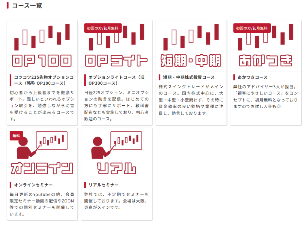| 主な有料コース | ・OP100コース(月額20,000円) ・オプションライトコース(月額9,800円、初月無料) ・短期・中期株式投資コース(月額20,000円) ・あかつきコース(月額9,800円、初月無料) ・成果報酬コース(基本報酬50,000円+実現損益の21.6%、募集停止中) |