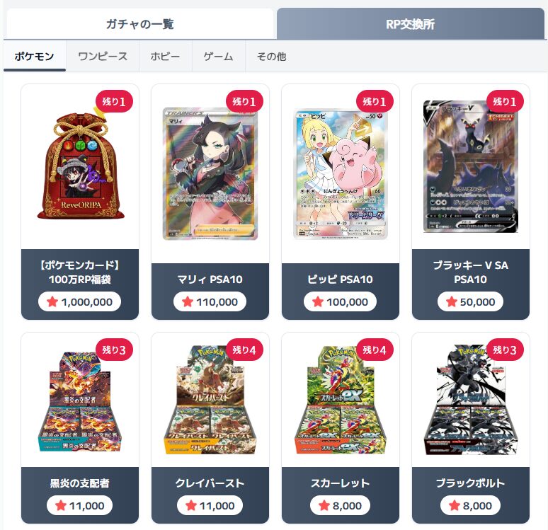 Reveオリパは、ポケモンカードを中心に一部ホビー系の商品を扱っており、ガチャで獲得したRPを使ってカードだけでなく家電や実用品と交換できる点が特徴です。