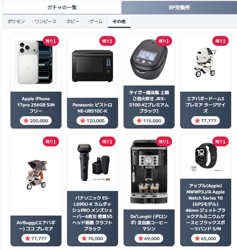 ReveオリパのRP交換所では、トレーディングカードに加えて家電や日用品、ホビー商品などが用意されています。