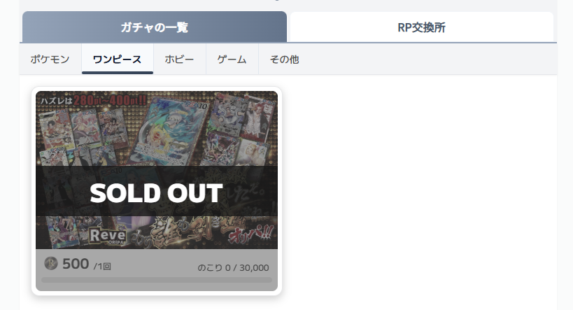Reveオリパのガチャ一覧にはワンピースカードのタブも用意されていますが、本記事の執筆時点ではガチャは1種類のみで、その1種類もすでにSOLD OUTとなっている状態でした。