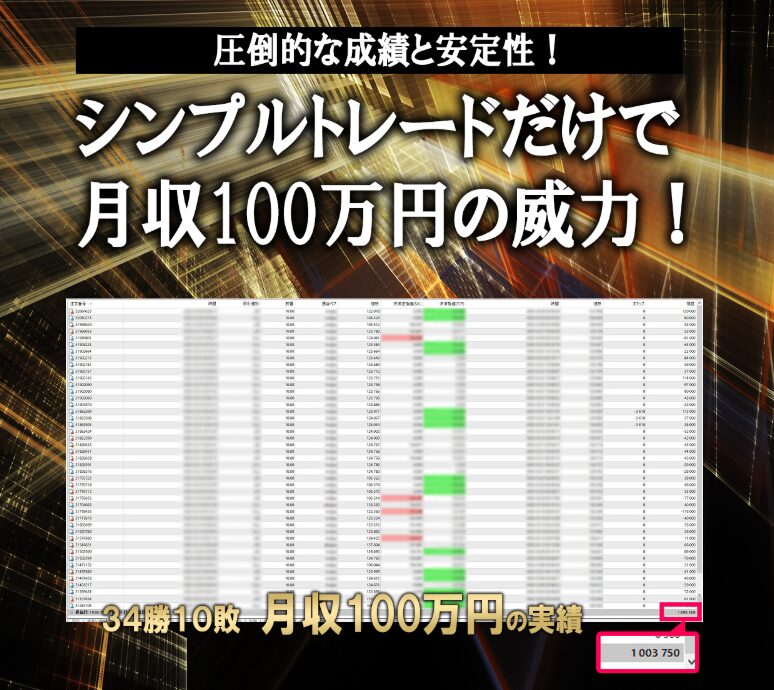 セールスページでは「月収100万円が目指せる」といった実績が紹介されていますが、その詳細な取引履歴や勝率データは多くの部分がモザイク処理されており、客観的な検証が困難な状態です。