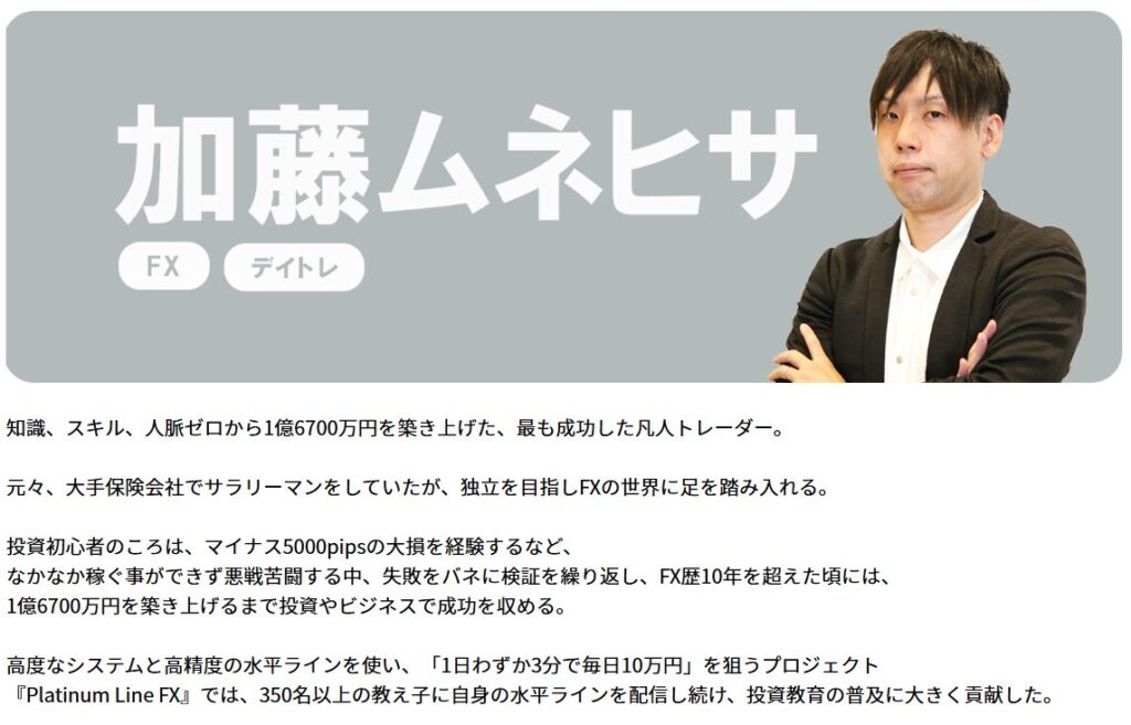 同氏の公式プロフィールには「知識、スキル、人脈ゼロから1億6700万円を築き上げた」との記載があり、過去には「Platinum Line FX」という別のFX商材も同グループから販売しています。