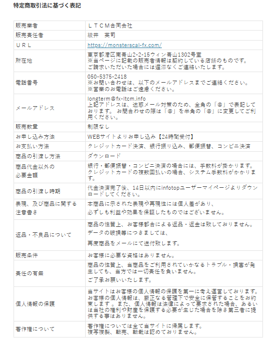 綾井英司氏は、モンスタースキャルFXの販売元であるLTCM合同会社の販売責任者として特定商取引法の表記に記載されている人物です。