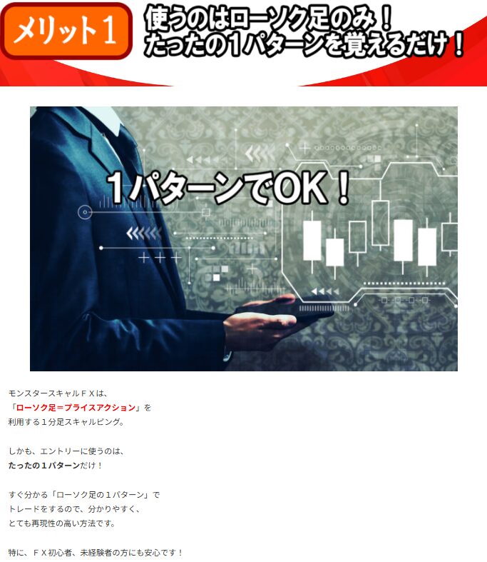 モンスタースキャルFXは、1分足チャートのみを使用して短期売買を行うスキャルピング手法を提供する教材として販売されています。