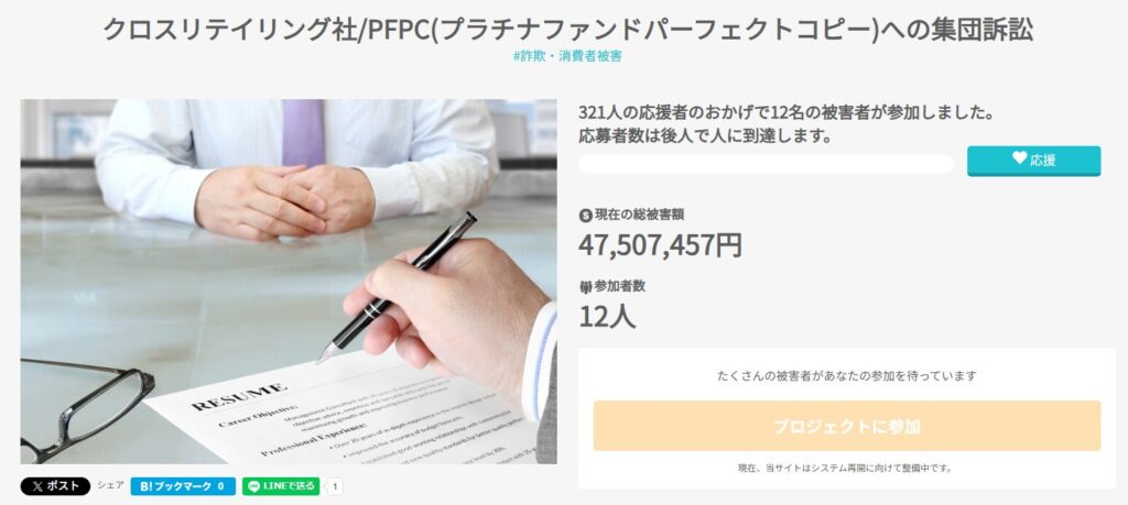 集団訴訟プラットフォーム上では、同社の販売する投資情報商材に対して12人が訴訟に賛同し、被害総額は4700万円に上るとの情報が公開されています。