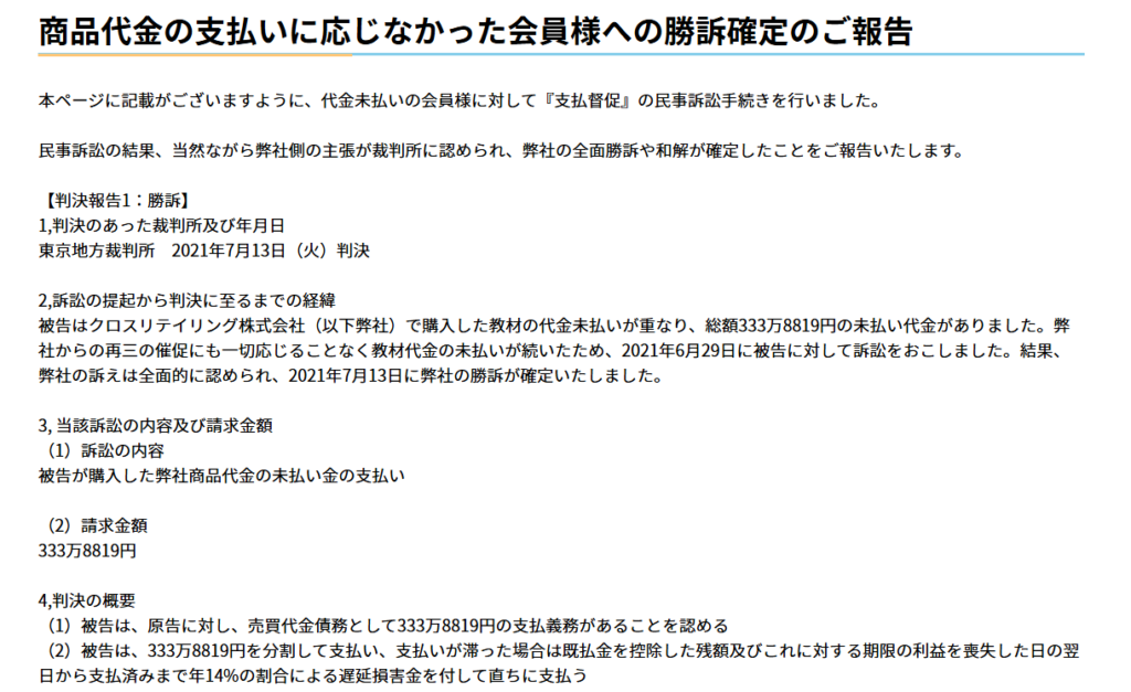 一方で同社は未払い購入者に対して積極的に訴訟を起こす側でもあり、実際に東京地方裁判所で333万円の支払いを命じる判決を得た事例も確認されています。
