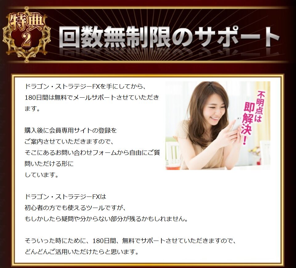 ドラゴン・ストラテジーFXは購入後に会員専用サイトへの登録が案内され、180日間の無料サポートが提供されます。