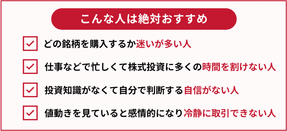 作業時間はほぼゼロに近い状態まで削ぎ落とされているため、「忙しくて投資が続けられない…」という挫折を防いでくれます。