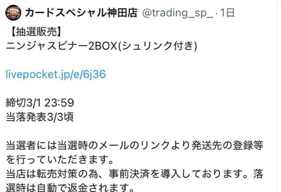最終的に「カードスペシャル神田店」のXアカウントは削除され、LivePocketの抽選ページも非公開となりました。