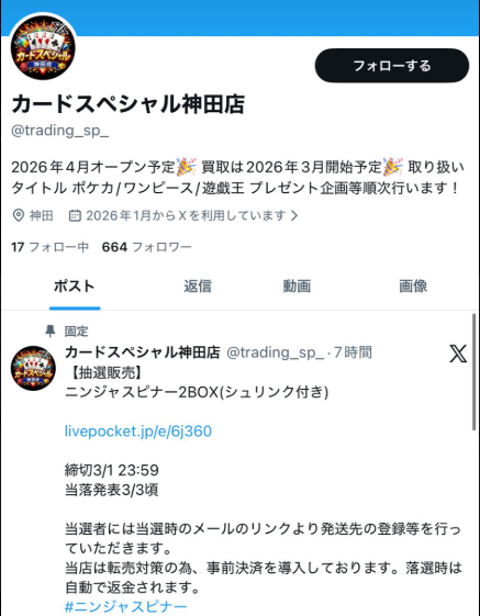 このアカウントでは、店舗のオープン日や販売内容(ポケモンカードの抽選販売)などの情報が投稿されていて、一見すると通常のカードショップに見えてしまいます。