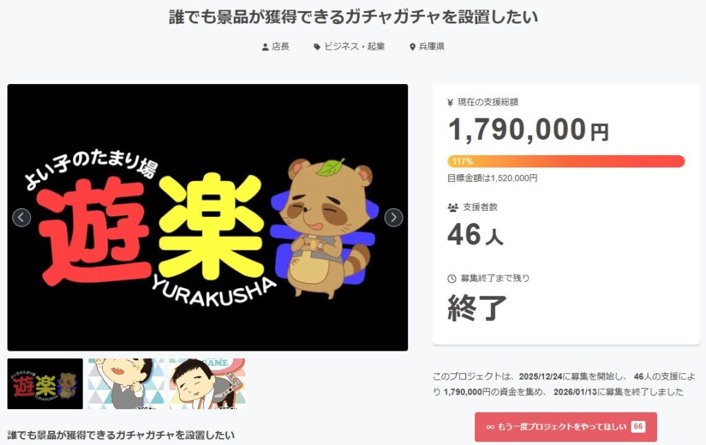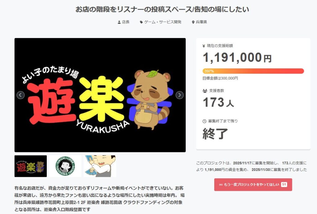 遊楽舎は2025年に、店舗関連のプロジェクトとしてクラウドファンディングを実施しています。