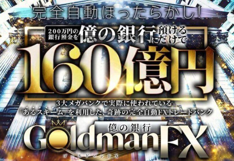GoldmanFX(ゴールドマンFX)は「億の銀行」「完全自動FXトレードバンク」といった派手なフレーズで集客する自動売買型の投資系情報商材です。
