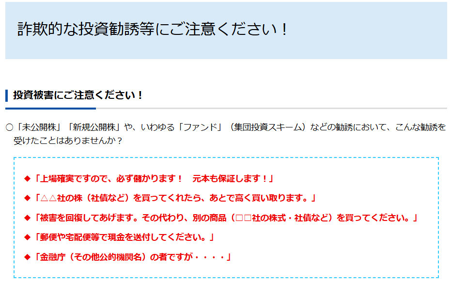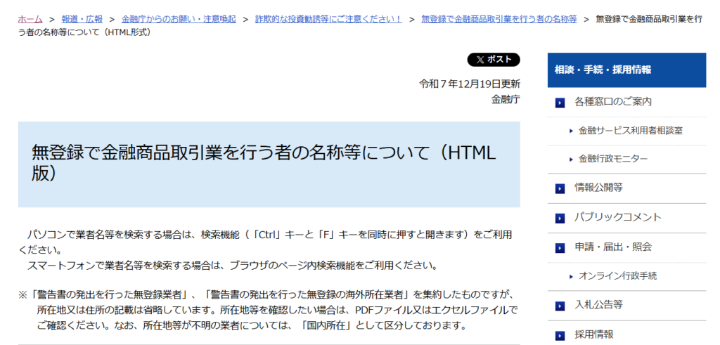 金融庁や財務局は無登録業者との取引について繰り返し注意喚起を行っており、登録業者かどうかは金融庁サイトで確認できます。