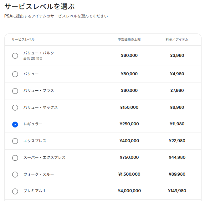 例えば、申告価格が500ドル以下であればValue、2,500ドル程度までならRegular、といったように上限が設定されています。