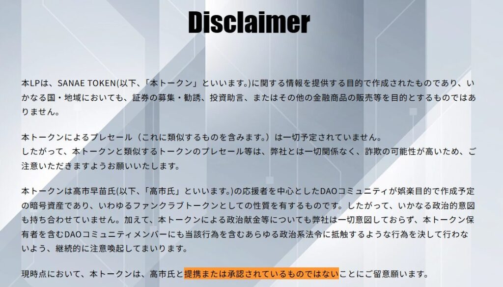 実はサナエトークンの公式サイトには、「本トークンは高市氏と提携・承認されていない」という旨の免責事項が記載されていました。