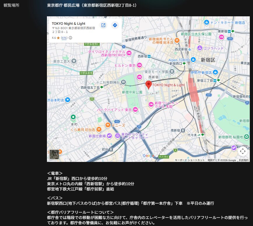 観覧場所は東京都庁の都民広場となっており、新宿エリアから徒歩でアクセス可能です。