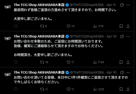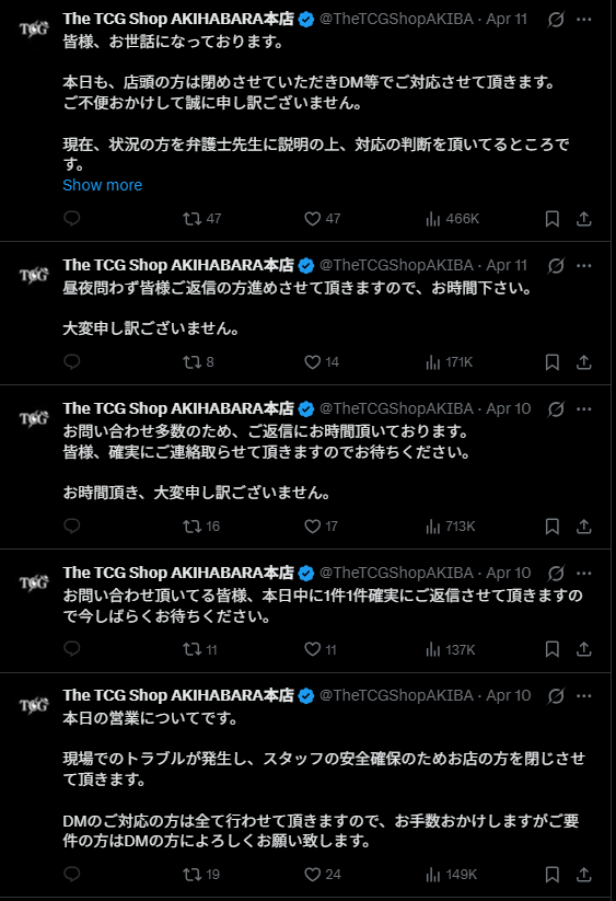 この記事では、今回のThe TCG Shop AKIHABARA本店の倒産に至るまでの一連の事件について、何が起きたのか、どのように拡散したのかを、時系列とSNSの情報をもとに整理していきます。