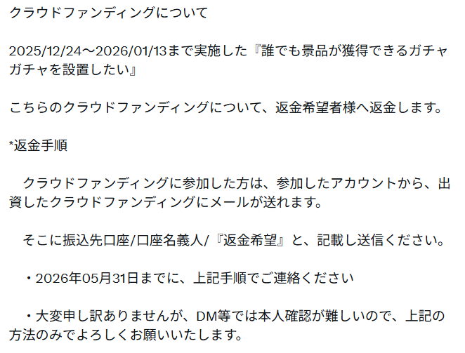 結果として、「資金はどうなったのか」「ガチャ設置は実施されるのか」「返金はあるのか」といった疑問が残る形となりました。